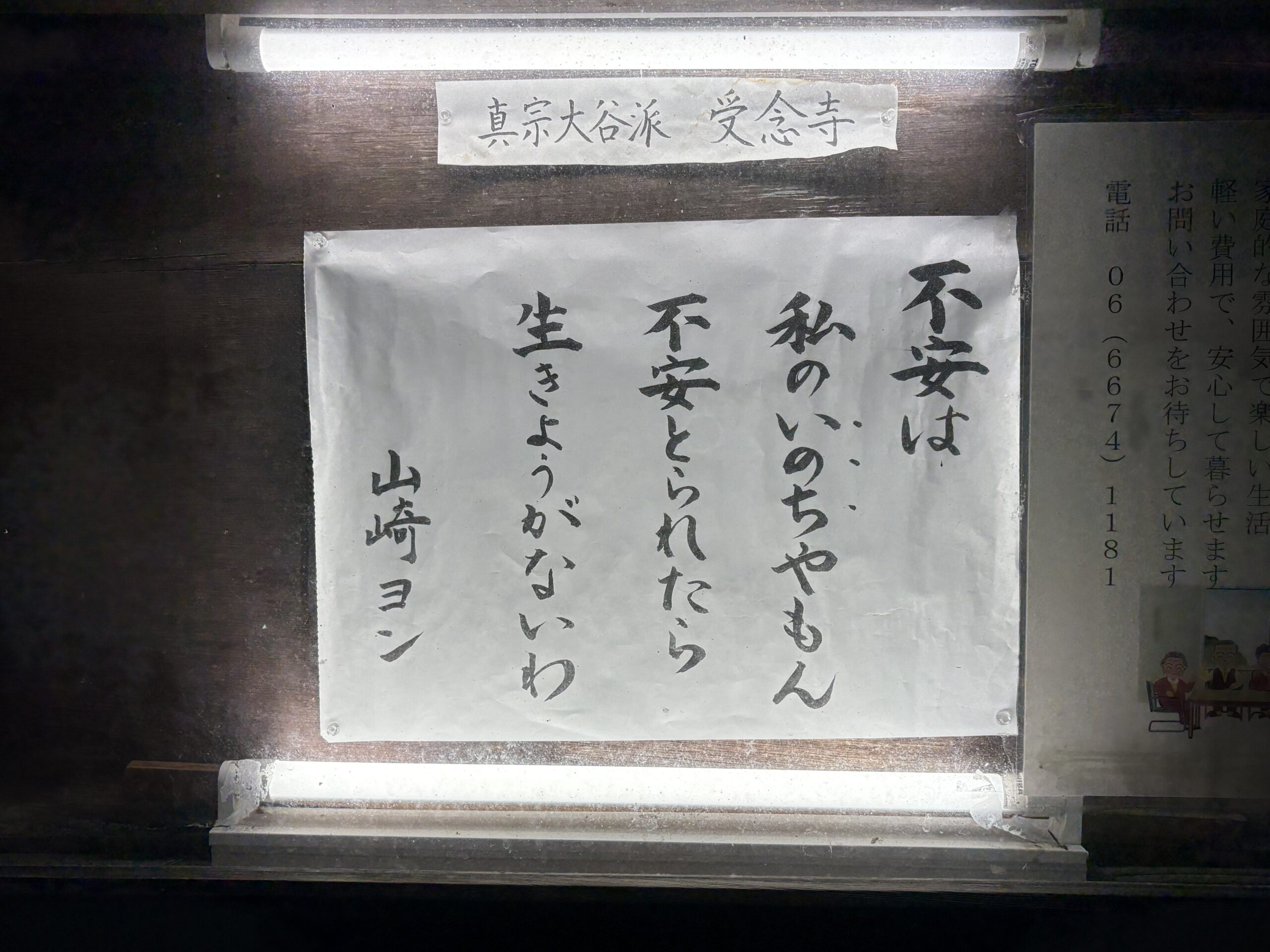 こないだも、ある新興宗教の方がこられて、「婆ちゃん、不安ないか」とおっしゃる。「ええ、不安ありますよ」というと、その人、「不安あるでしょう。わたしら、その不安をとる会を無料でしとるさけ、婆ちゃんもそこにいって、不安とってもろたらどうや」といわれる。