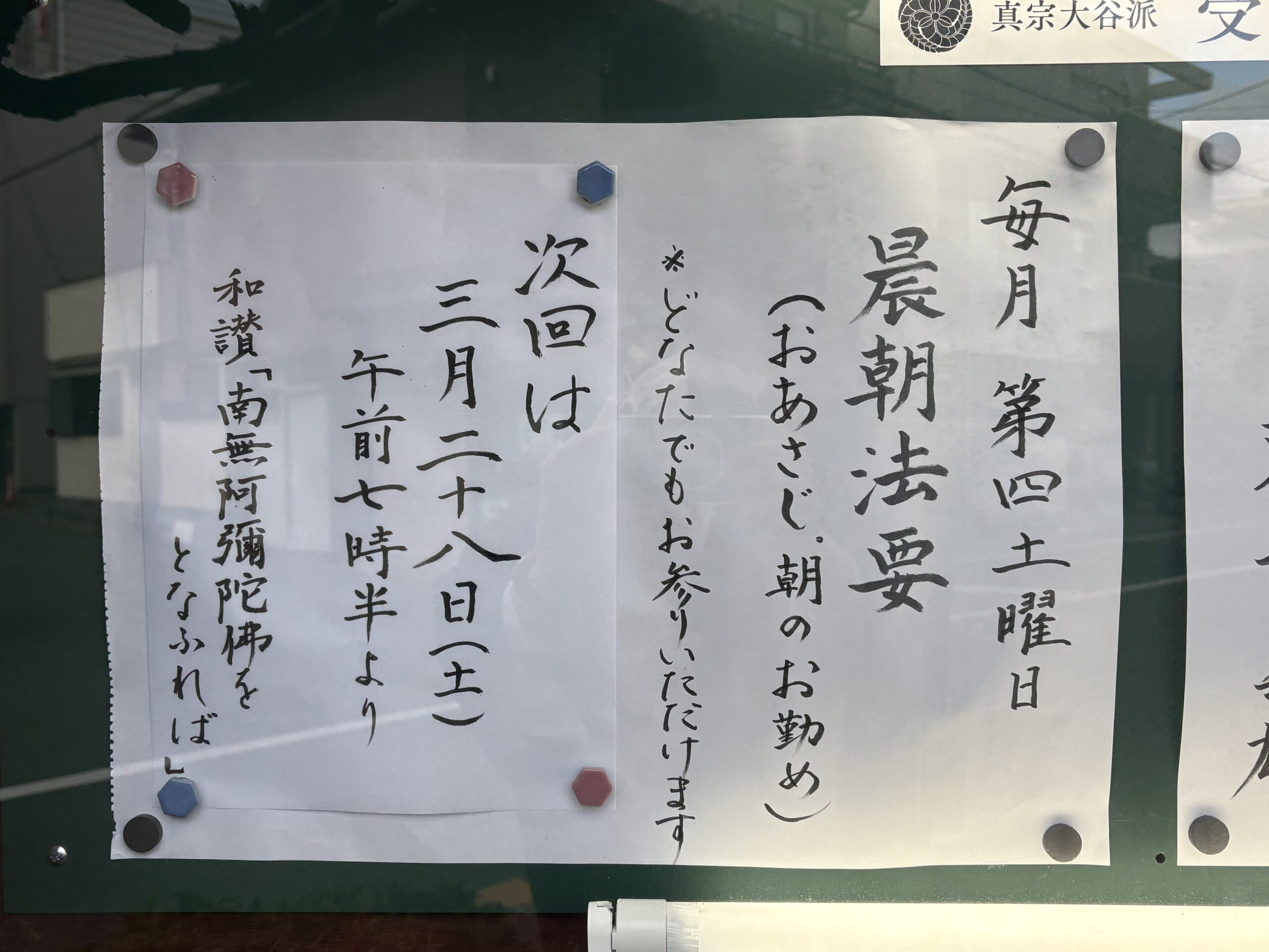 お知らせ2026.03.023月の晨朝法要(おあさじ) ポスト シェア はてブ 送る Pocket 受念寺では、2026年から、第4土曜日・午前7時半〜、晨朝法要(おあさじ)を行っています。15分ほどのおつとめです。 正信偈(草四句目下) 念仏和讃(同朋奉讃第二)(今月の和讃は「南無阿弥陀仏をとなふれば」です) 回向(願以此功徳) ミニ法話 3月は、3月28日(土)です。 普段の生活の軸として、どなたでもお参りください。
