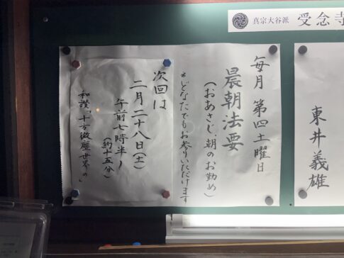 受念寺では、2026年から、第4土曜日・午前7時半〜、晨朝法要(おあさじ)を行っています。15分ほどのおつとめです。 正信偈(草四句目下) 念仏和讃(同朋奉讃第二)(今月の和讃は「十方微塵世界の」です) 回向(願以此功徳...