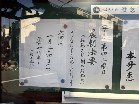 未分類受念寺では、1月から第4土曜日・午前7時半から、晨朝法要(おあさじ)を行います。 明日1月24日(土)が初回です。 普段の生活の軸として、どなたでもお参りください。